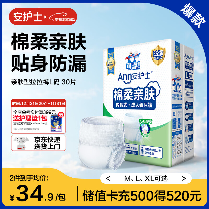 安护士棉柔亲肤成人拉拉裤L30片 (臀围95-120cm)内裤型纸尿裤尿不湿