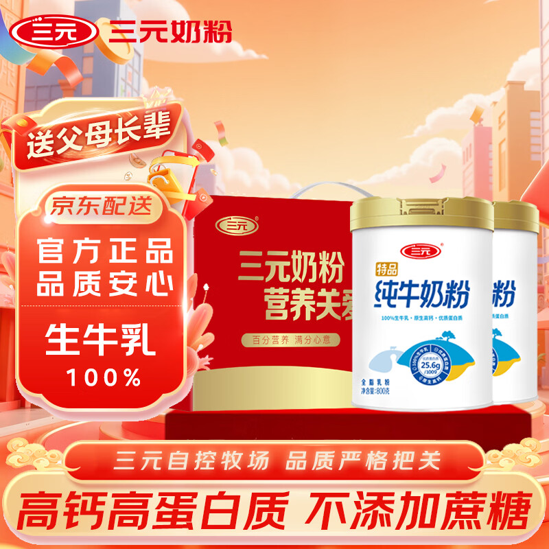 三元(SAN YUAN)纯牛奶粉800克2罐礼盒装 100%生牛乳 高钙高蛋白质 节日送礼