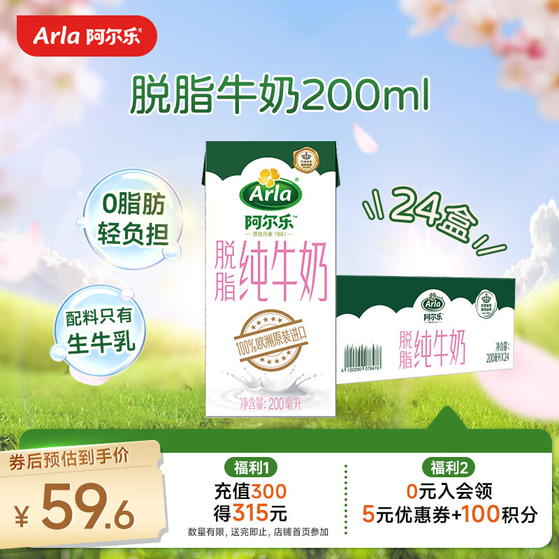 阿尔乐德国原装进口脱脂纯牛奶 200ml*24盒3.6g蛋白早餐礼盒整箱装