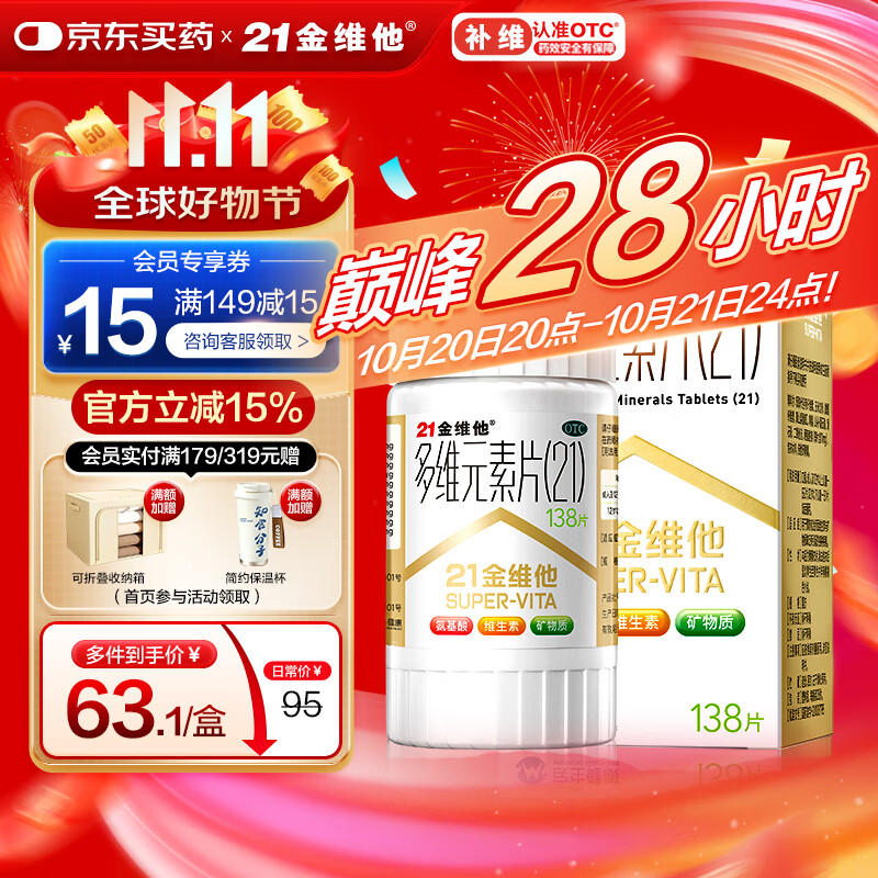 21金维他 多维元素片(21) 138片 复合维生素B族成人赖氨酸维C维E钙铁锌AD儿童中老年多种营养增强免疫力