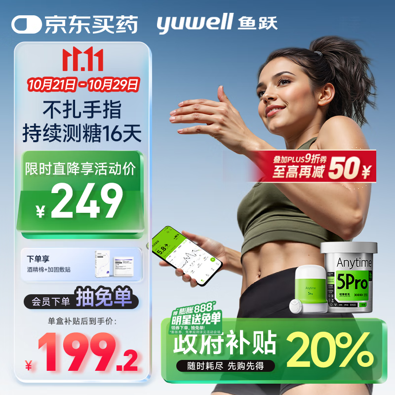鱼跃(Yuwell)安耐糖动态血糖仪Anytime5Pro免扎手指家用16天持续血糖监测仪