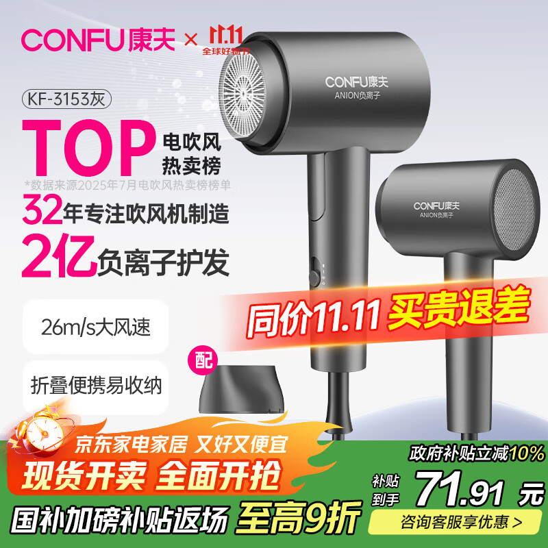 康夫(CONFU)2亿负离子护发电吹风机折叠家用大风大功率不伤发国家补贴宿舍吹风筒1600W KF-3153灰