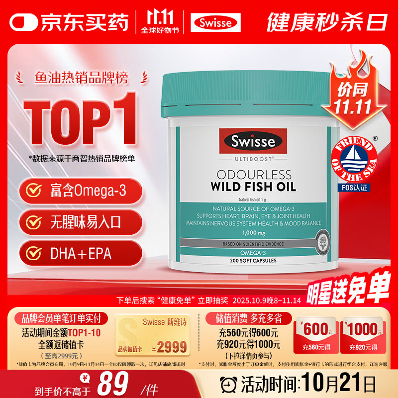 Swisse斯维诗 无腥味野生鱼油软胶囊1000mg omega-3 DHA+EPA 200粒/ 瓶