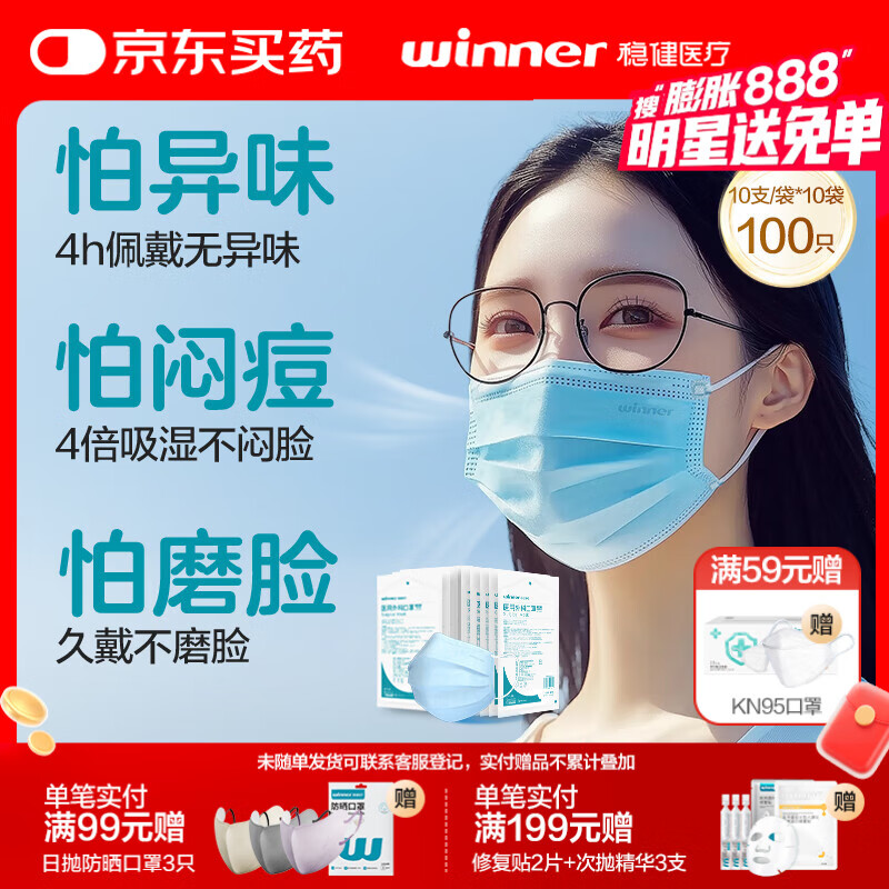 稳健医用外科口罩灭菌级 棉里层亲肤透气防花粉过敏性鼻炎保暖100只