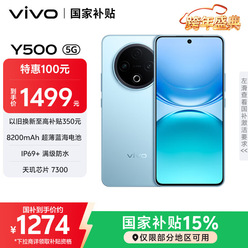 vivo Y500 8GB+256GB 冰川蓝 8200mAh超薄蓝海电池 IP69+满级防水 越级旗舰外观 耐用抗摔 AI手机