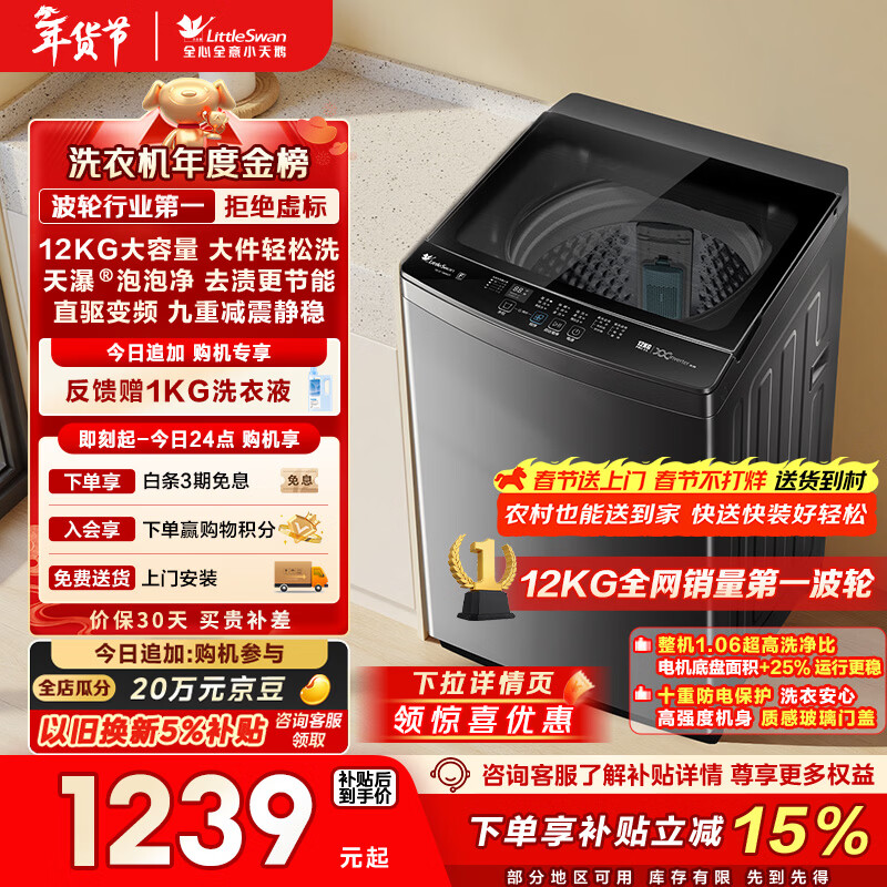 小天鹅(LittleSwan)波轮洗衣机全自动家用 12KG大容量 直驱变频 TB12-1809DT 以旧换新 国家补贴 京东自营 一级能效