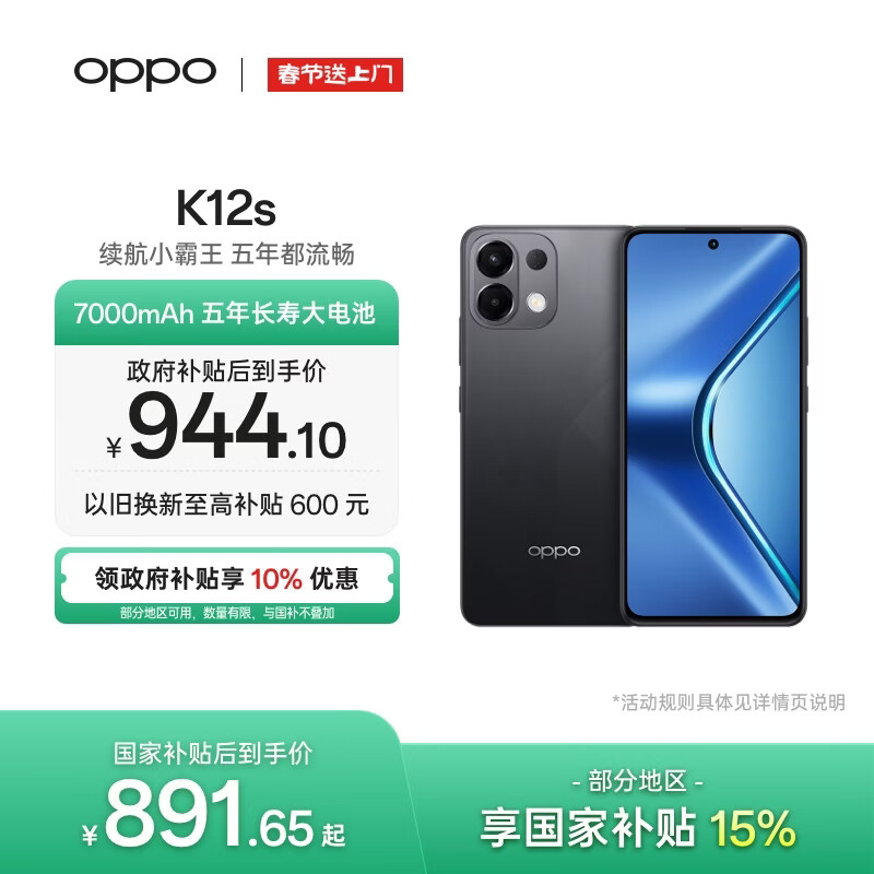 OPPO K12s 8GB+128GB 棱镜黑 7000mAh长续航大电池 OLED 直屏 骁龙学生 5G 游戏千元新款手机 国家补贴