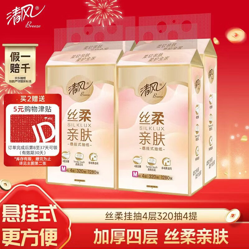 清风(APP)挂抽纸 悬挂式抽纸 丝柔4层320抽*4提M码 面巾纸擦手纸餐巾纸
