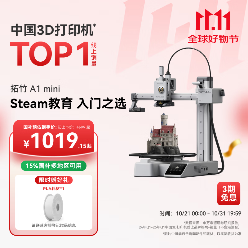 拓竹A1mini 3D打印机学生新手友好 儿童Steam教育 桌面家用FDM 全自动调平多色高速bambulab【大陆版】