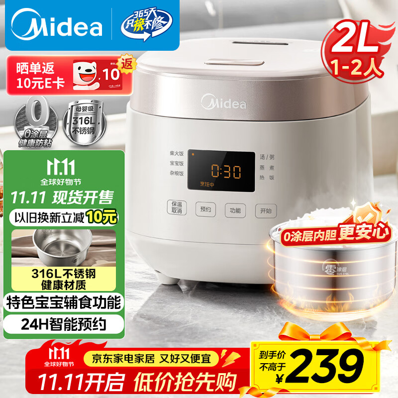 美的(Midea)0涂层2L不锈钢内胆1-2人电饭煲电饭锅 家用智能多功能微压无涂层电饭煲MB-RC201S礼品团购