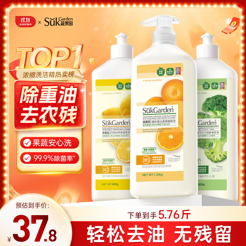 蔬果园洗洁精轻松去油家庭装洗涤剂果蔬餐具清洁剂宝宝餐具可用2.88kg