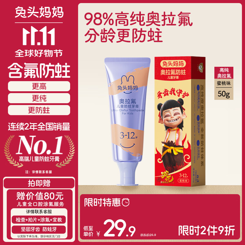 兔头妈妈哪吒联名 高纯奥拉氟儿童牙膏防龋防蛀牙蜜桃味不辣口3-12岁