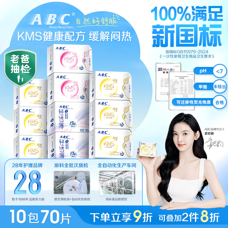 ABCKMS纤薄健康配方超薄透气日夜卫生巾套装京东自营10包70片