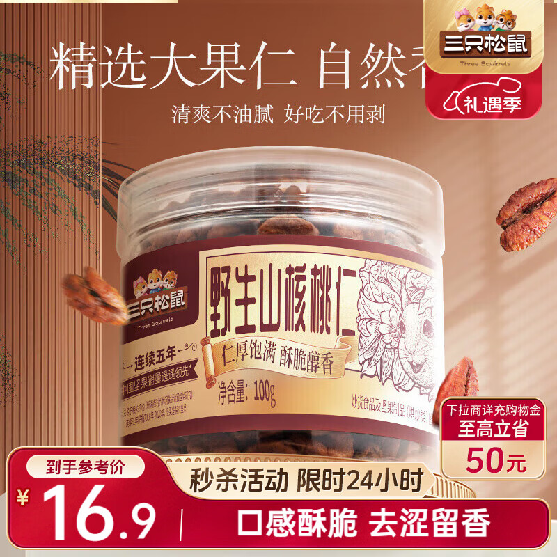 三只松鼠野生山核桃仁 每日坚果炒货休闲零食免剥果仁罐装100g/罐