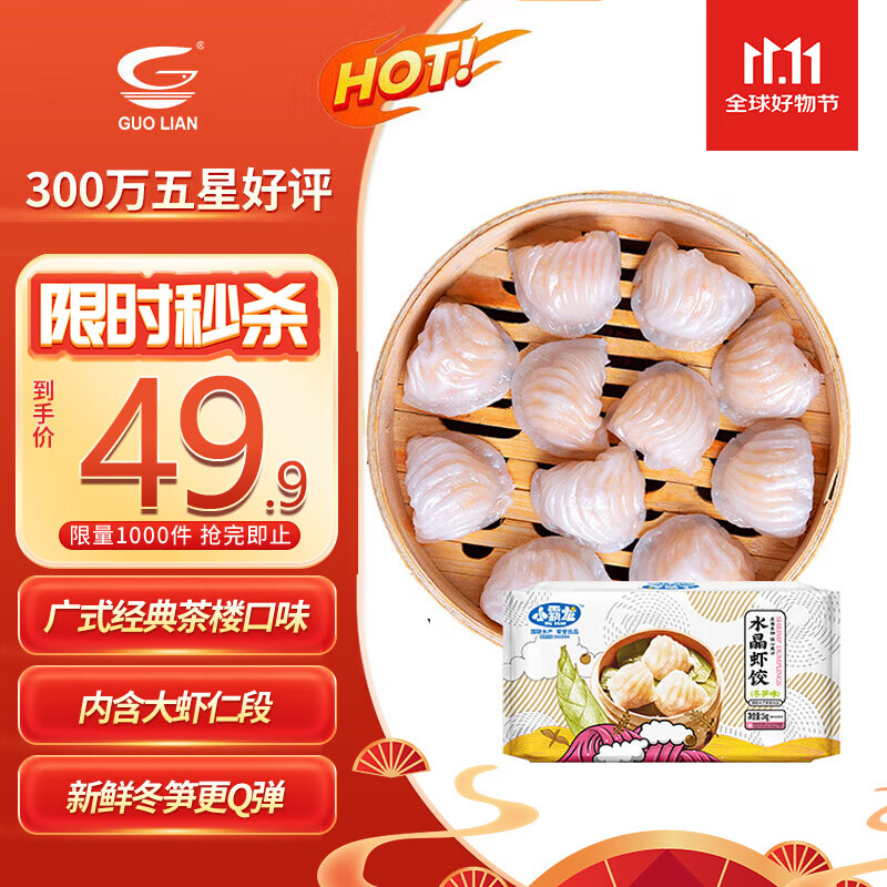 GUO LIAN国联冬笋水晶虾饺 1kg 40只 袋装 广式早茶早餐点心预制菜半成品