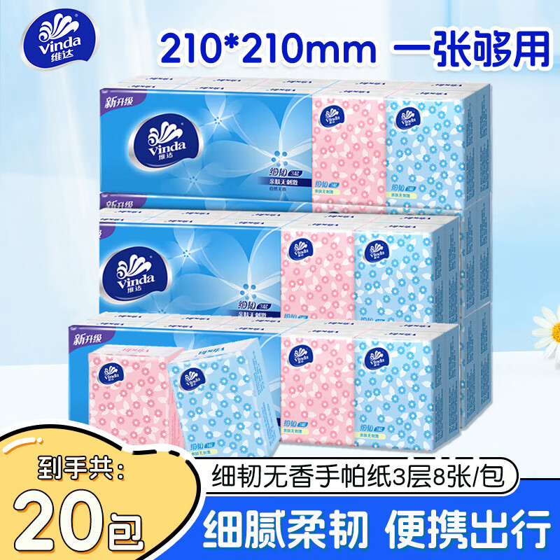 维达(Vinda)手帕纸 便携式小包纸巾 细韧手帕餐巾纸卫生纸 3层 8片*20包