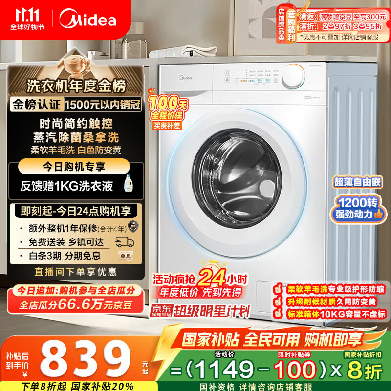 美的(Midea)滚筒洗衣机全自动家用 MG100V11FPRO 10公斤超薄 双重除菌三重洗涤守护 以旧换新 家电国家补贴20%