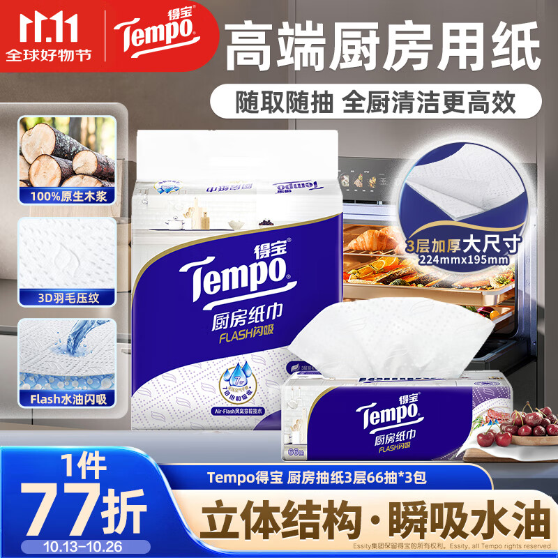 得宝(TEMPO)一博同款 厨房抽纸66抽*3包 水油瞬吸 厨房用纸 吸油纸 懒人抹布