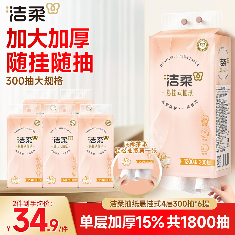 洁柔抽纸面巾纸 悬挂式挂抽4层300抽*6提餐巾纸擦手纸厕纸整箱卫生纸