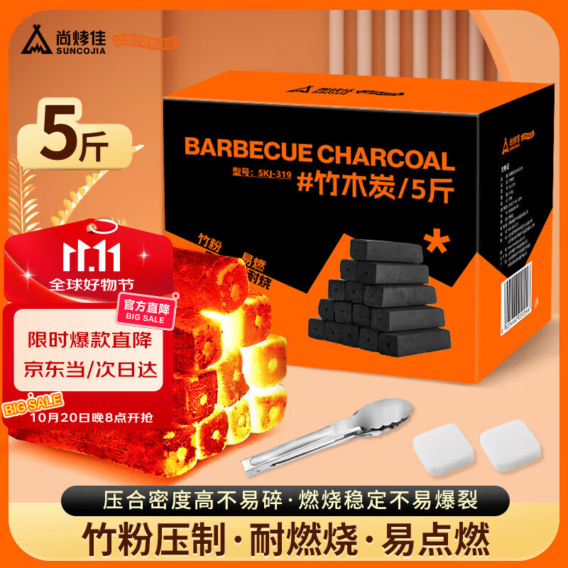 尚烤佳(Suncojia) 无烟烧烤木炭 竹炭 烧烤炉烧烤木碳 条形空心炭 取暖火锅炭 5斤