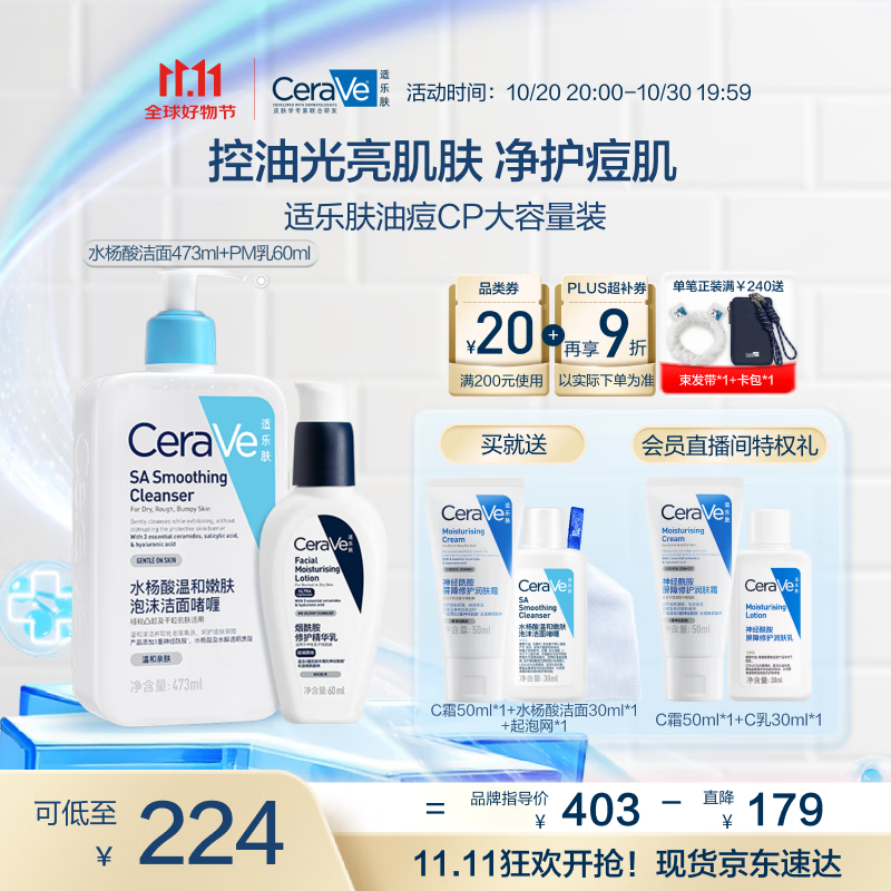 适乐肤(CeraVe)油痘CP(水杨酸洁面473ml+PM乳60ml)乳液洁面水杨酸洗面奶清洁毛孔