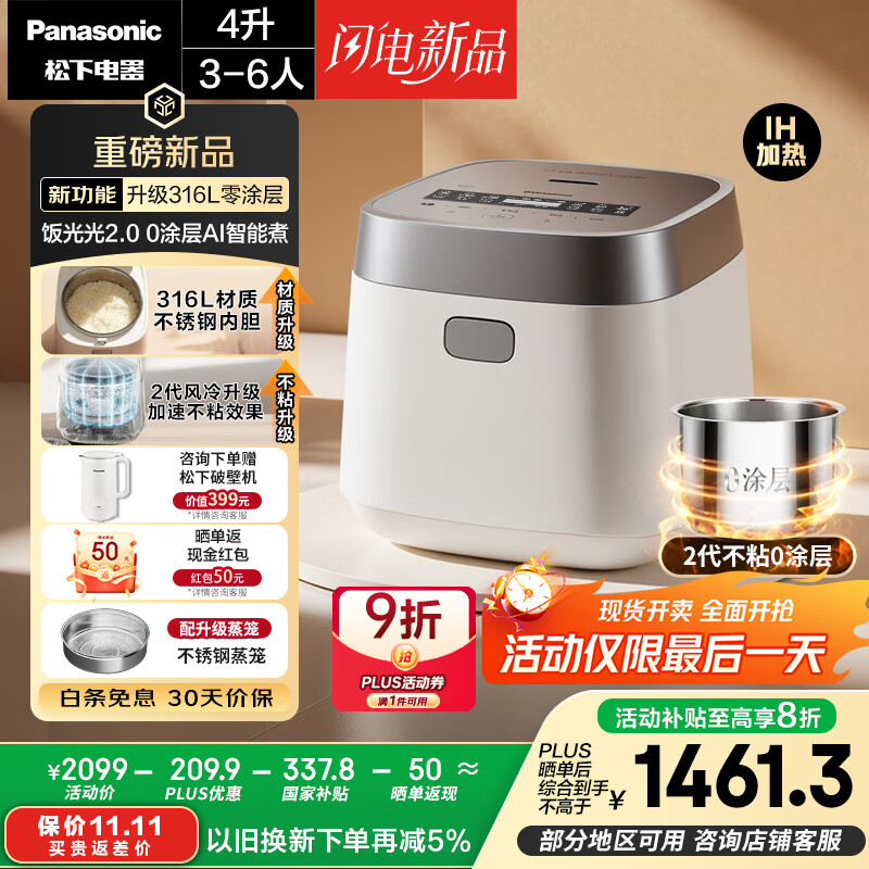 松下(Panasonic)【国家补贴20%】饭光光2.0电饭煲0涂层IH加热家用电饭锅4-5人无涂层不锈钢一级能效4升SR-HNS152-W