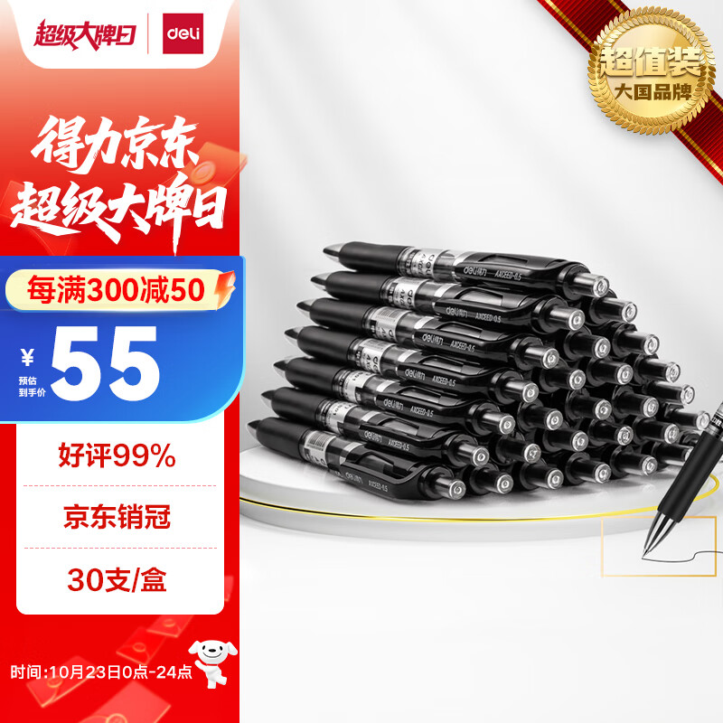 得力(deli)S01中性笔签字笔 0.5mm子弹头经典办公按动笔水笔 黑色 30支/盒 33489