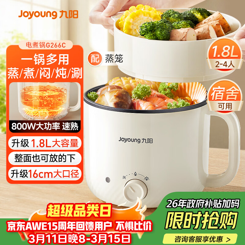 九阳(Joyoung)多功能锅电热锅小煮锅电蒸锅火锅锅学生宿舍电煮锅1-2人1.8L泡面电火锅HG18-G266C【蒸笼款】
