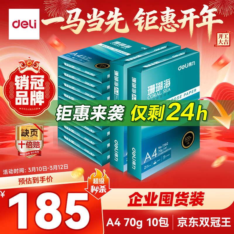 得力(deli)珊瑚海A4打印纸 70g500张*10包一箱 双面复印纸 企业采购优选 整箱5000张7363