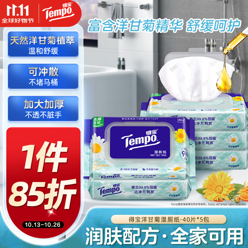 得宝(TEMPO)一博同款 洋甘菊湿厕纸 40片*5包 植萃精华 可冲散 湿纸巾 湿巾