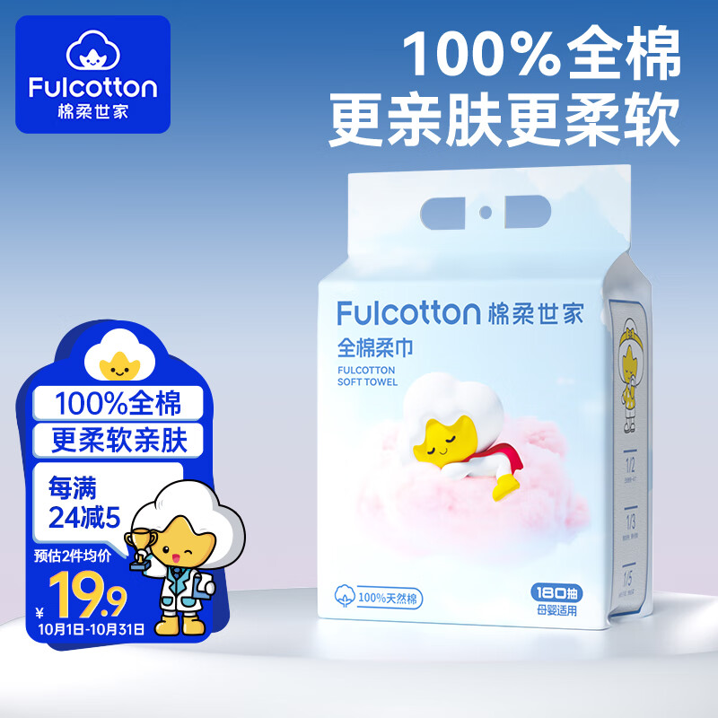 Fulcotton棉柔世家悬挂式婴儿100%棉柔巾 一次性加厚洗脸巾擦脸巾180抽*1提