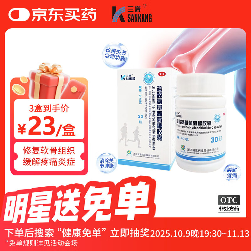 三康 盐酸氨基葡萄糖胶囊 0.75g*30粒 维骨力 治疗预防骨关节炎 缓解关节疼痛 氨糖软骨素 氨糖