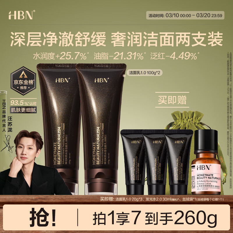 HBN洗面奶三重氨基酸表活男女洁面乳敏感肌保湿护肤2支女神节礼物