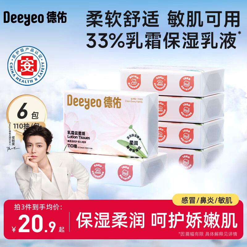 德佑乳霜纸3层110抽*6包 云柔巾柔纸巾婴儿保湿抽纸柔润面巾纸