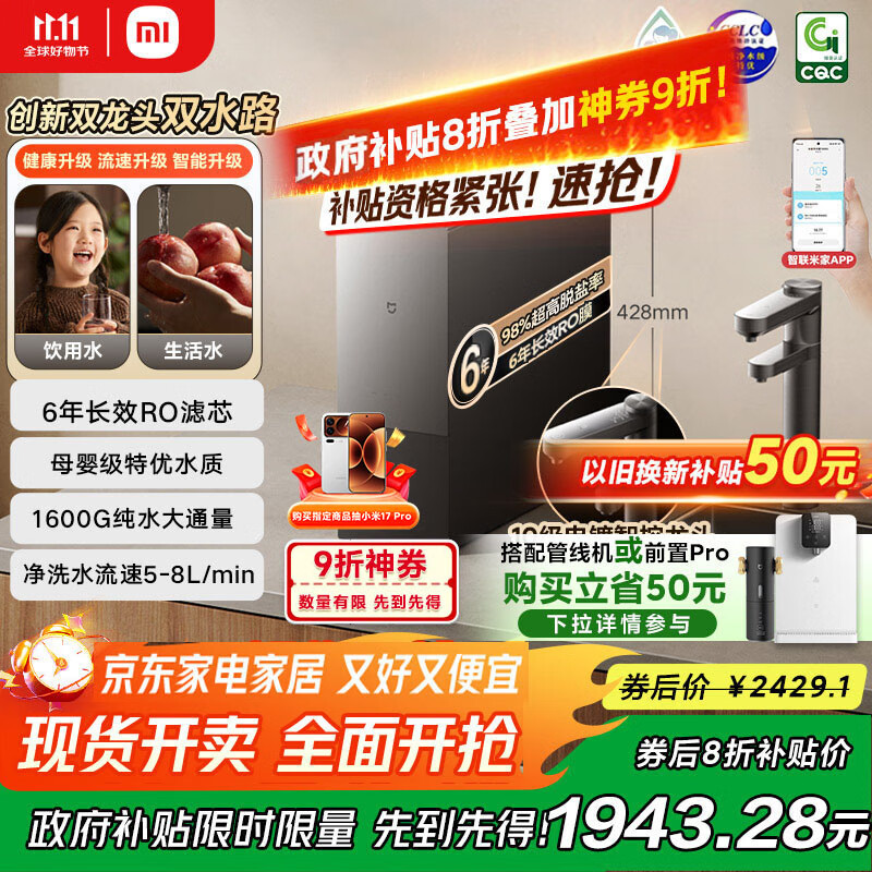 米家【政府补贴】小米净水器pro双出水双龙头1600G 家用厨下式 净水机 小米YU7发布会MR1692