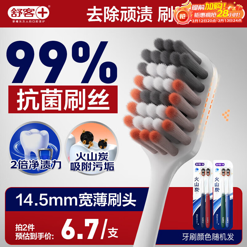 舒客宽头火山炭能牙刷4支装去异味软毛偏硬抑菌率99.9%新老随机