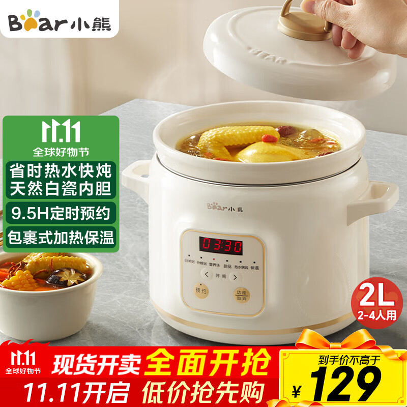 小熊(Bear)电炖锅 电炖盅 煲汤锅 炖汤锅 电砂锅 煮粥锅 婴儿熬粥家用可预约白瓷 2-4人用 DDG-E20M1米黄色2L