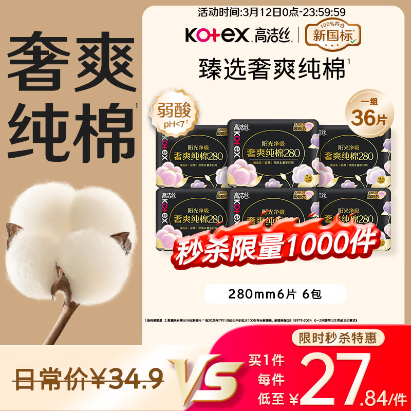 高洁丝【100%纯棉】臻选奢爽卫生巾280mm36片日用姨妈巾京东自营旗舰店