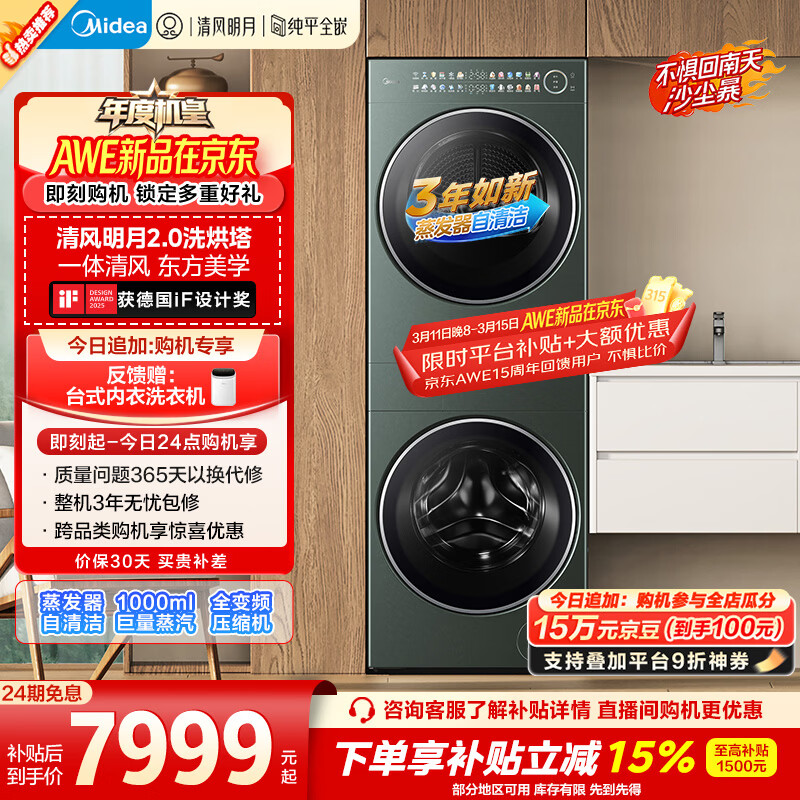 美的(Midea)年度机皇 清风明月2.0洗烘塔 洗烘套装 10KG滚筒洗衣机全自动+热泵烘干机 MGH20A-G+MAX 国家补贴