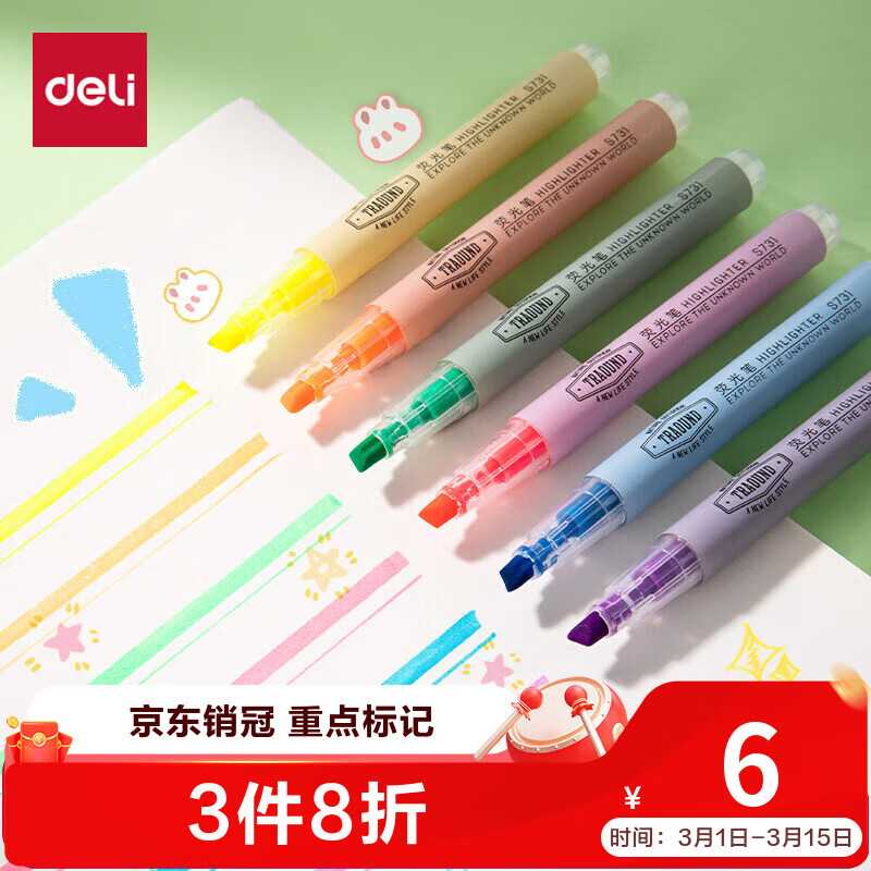 得力(deli)经典6色荧光笔 考试复习划重点彩色醒目标记笔 办公记号笔手帐S624 开学文具