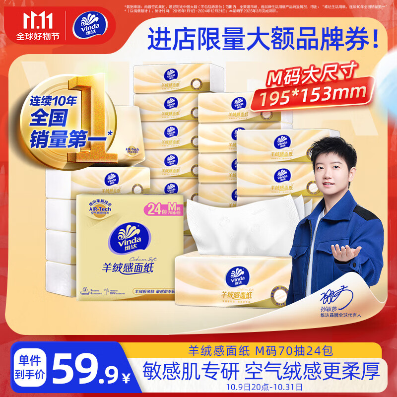 维达(Vinda)抽纸 羊绒感面纸70抽*24包M码 敏感肌适用 卫生纸纸巾 纸抽整箱
