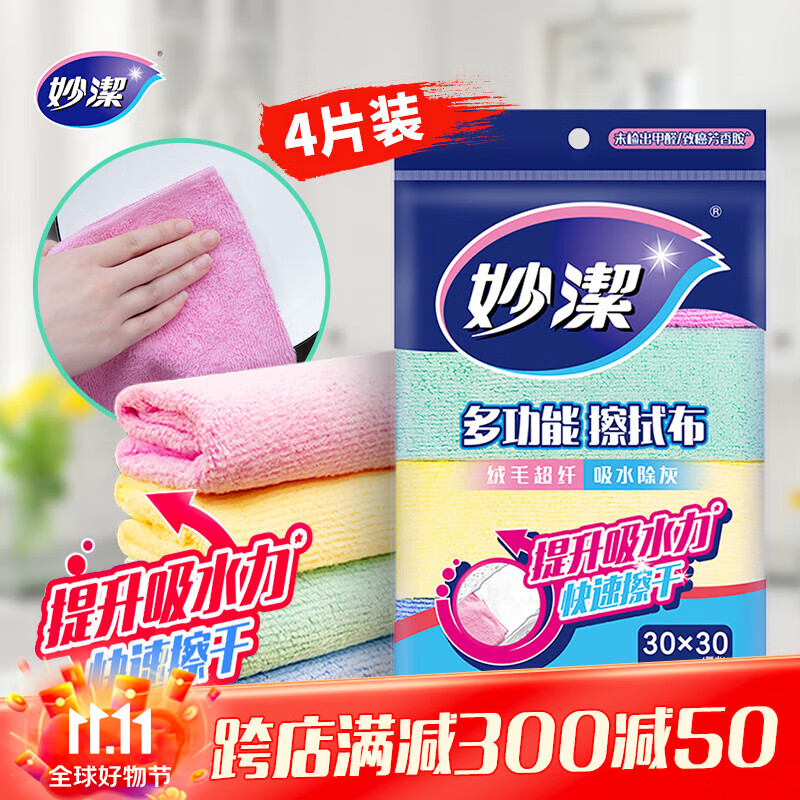 妙洁多功能擦拭布30*30cm 4片装 超纤抹布 磨毛快速擦干厨房家用神器