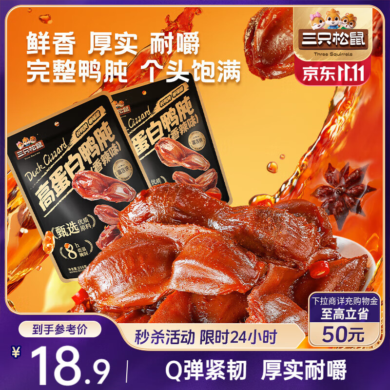 三只松鼠香辣鸭肫250g袋装休闲零食高蛋白卤味解馋约10小袋即食肉干肉脯