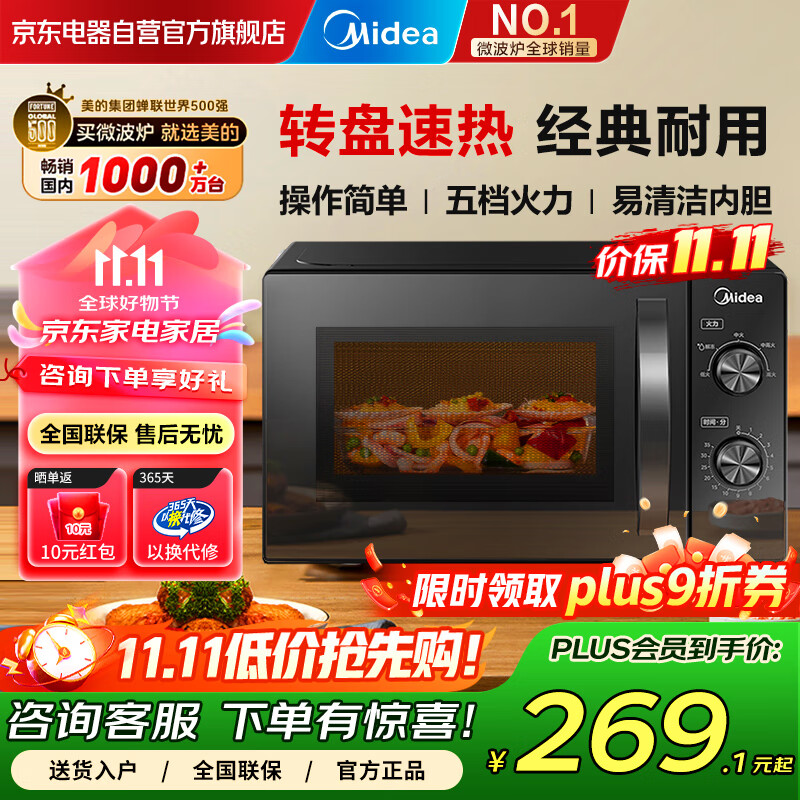 美的(Midea)家用便捷微波炉 转盘加热 五档火力 双旋钮操控 高温杀菌智能解冻 易洁内胆M20C