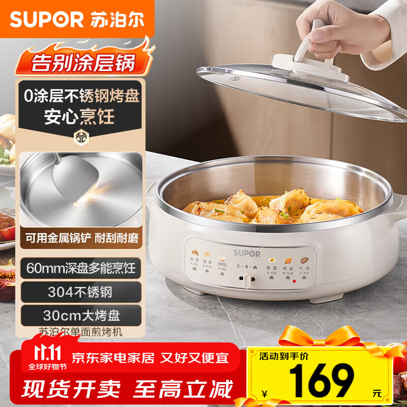 苏泊尔(SUPOR)电饼铛 0涂层 不锈钢电饼档家用 煎饼锅烤肉锅 烙饼锅早餐机煎烤机火锅煮锅 60mm加深 JT30A819