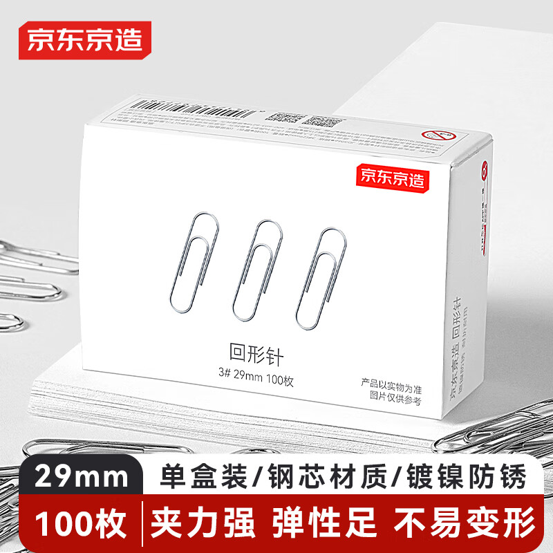 京东京造3#金属回形针别针 29mm镀镍防锈曲别针办公室文具办公用品 单盒装100枚/盒