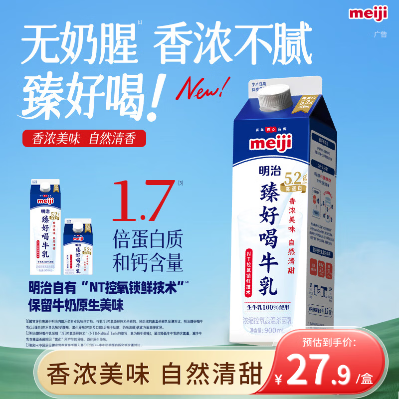 明治【国内奶源】臻好喝牛乳900ml 5.2g高蛋白 低温牛奶高温杀菌乳