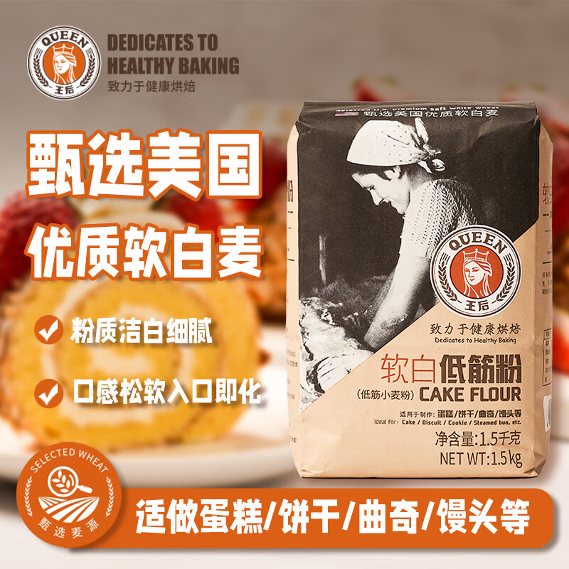 王后软白低筋粉1.5kg 烘焙小麦粉 无添加蛋糕粉饼干戚风曲奇面粉3斤