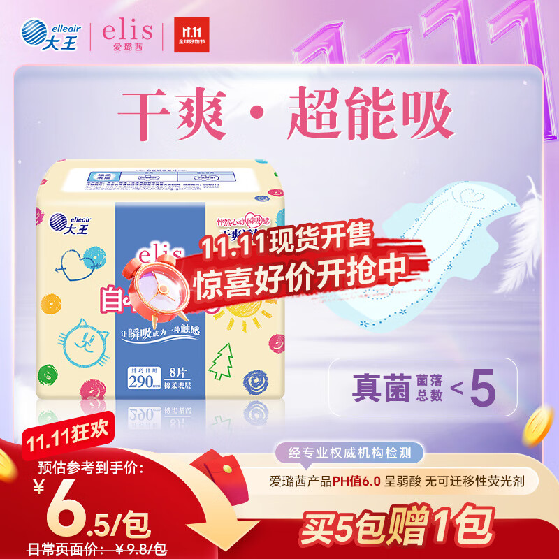 爱璐茜(elis)大王自在瞬吸夜用卫生巾棉柔290mm 8片 棉柔透气干爽量大姨妈巾