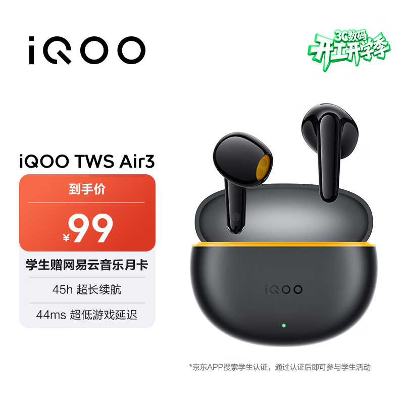 vivoiQOO TWS Air3 隐耀黄 KPL推荐蓝牙耳机 44ms超低游戏延迟 安卓iOS跨生态兼容